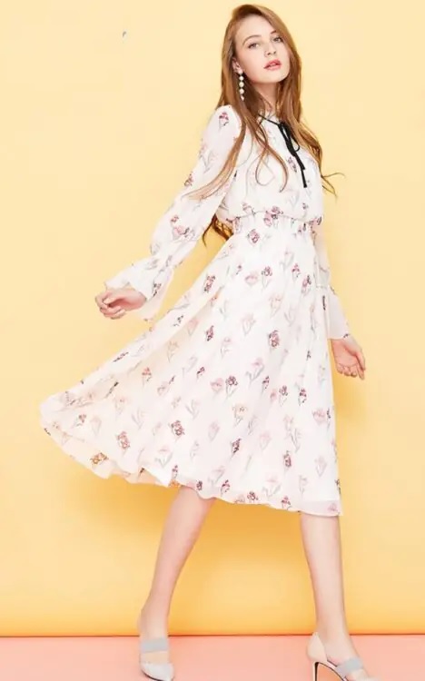 Yere neredeyse değmeyen uzun, uçuşan şifon elbise, parıldayan bir çiçek tarlasına benzeyen desenleriyle daha da canlı hale getirilmiş, ona genç ve güzel bir hava katmıştır.