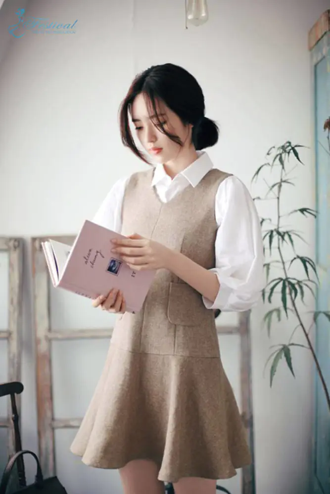 Geçiş mevsimlerinde ofis giyimi için mantıklı bir seçenek de kanvas veya yün kumaştan kolsuz elbiselerle gömlekleri bir araya getirmektir. Bu kombin hem resmî hem de mevsime uygun bir görünüm sunar.